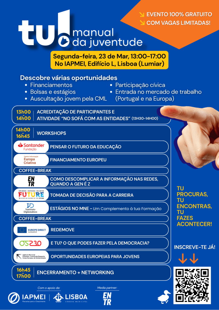 No próximo dia 23 de março, o Manual da Juventude organiza no IAPMEI, Edifício L, Lisboa o Evento TU, um encontro gratuito que pretende aproximar jovens de oportunidades nas áreas da educação, emprego e participação cívica.